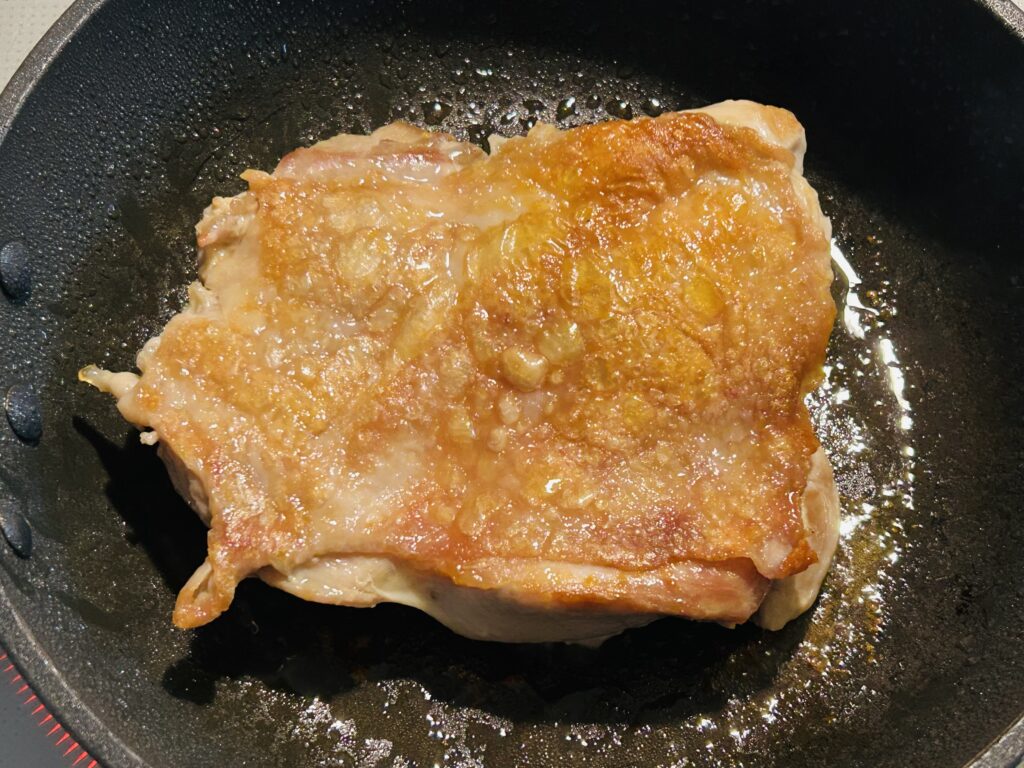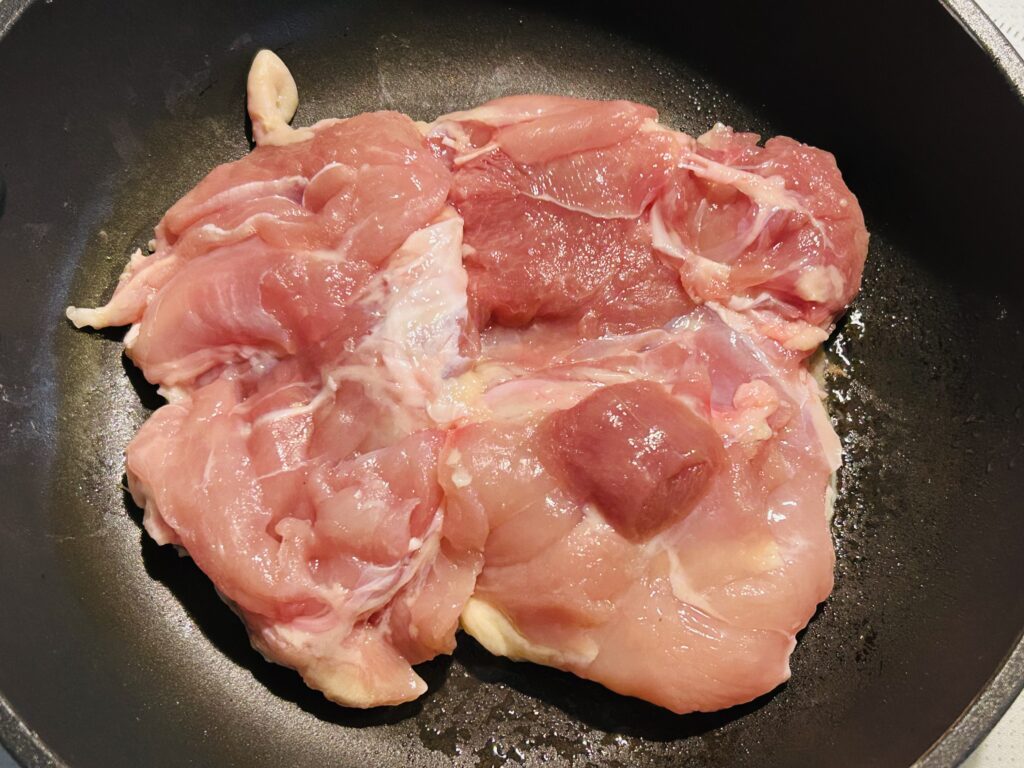 Heat a pan and place the chicken skin-side down. Cover with a lid and cook until the skin becomes nicely golden.
