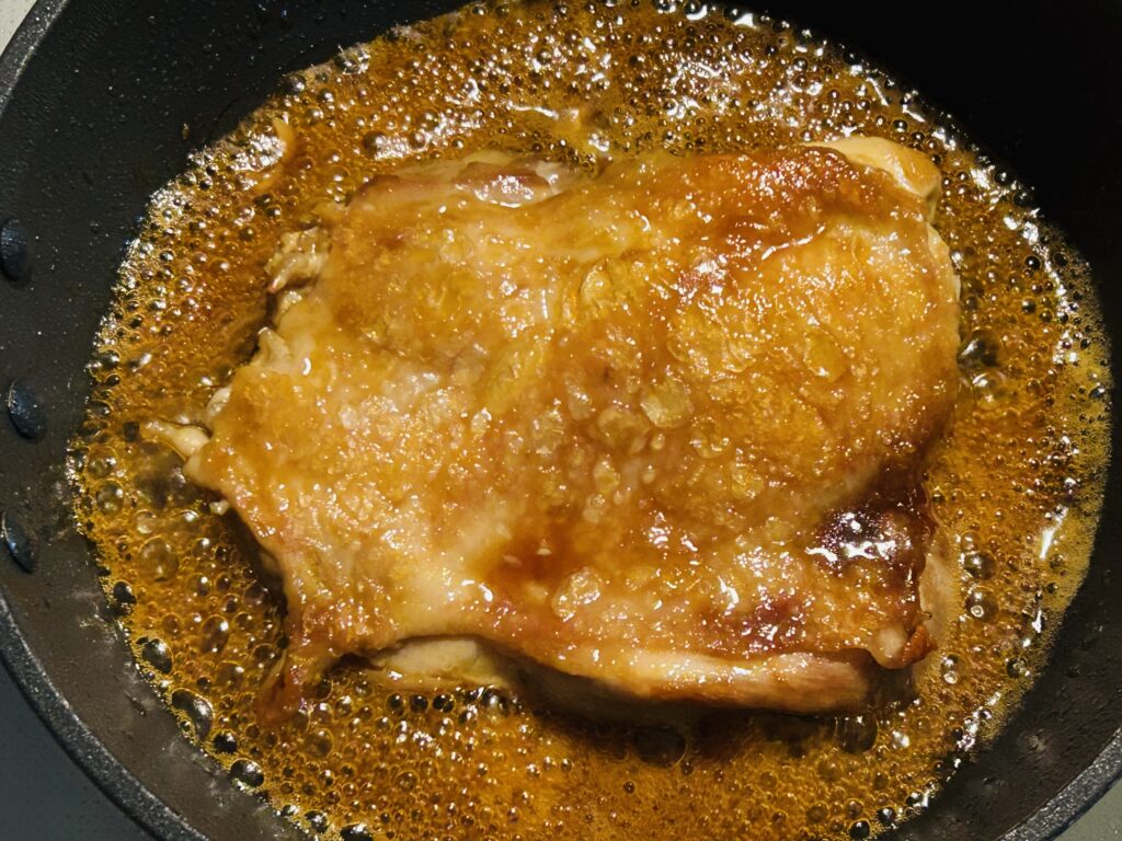 Add sake, mirin, sugar, and then soy sauce, in that order. Swirl the pan gently so the sauce coats the chicken evenly.